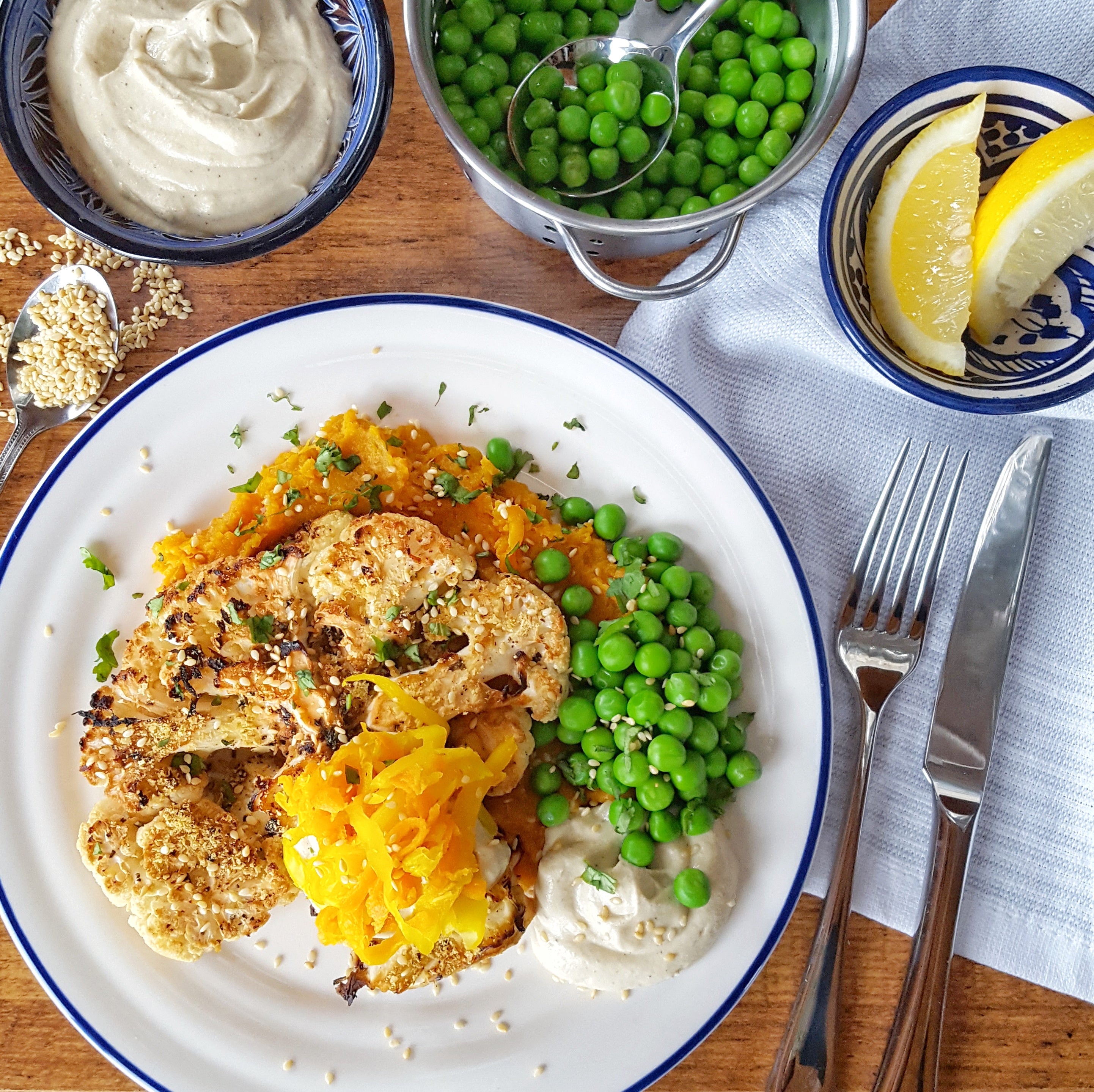 Garlic Lemon Cauliflower steaks with Cashew Cauliflower Sauce, Sweet Potato Mash and our Turmeric and Ginger Superkraut